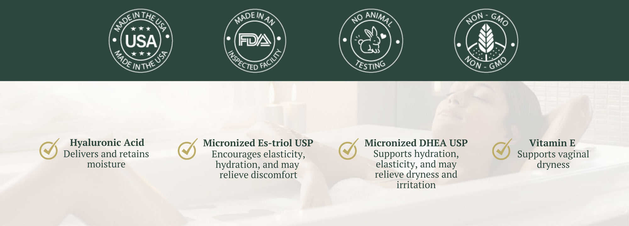 - DHEA, a precursor hormone, supports cellular repair and may enhance lubrication and local hormone balance when applied vaginally.