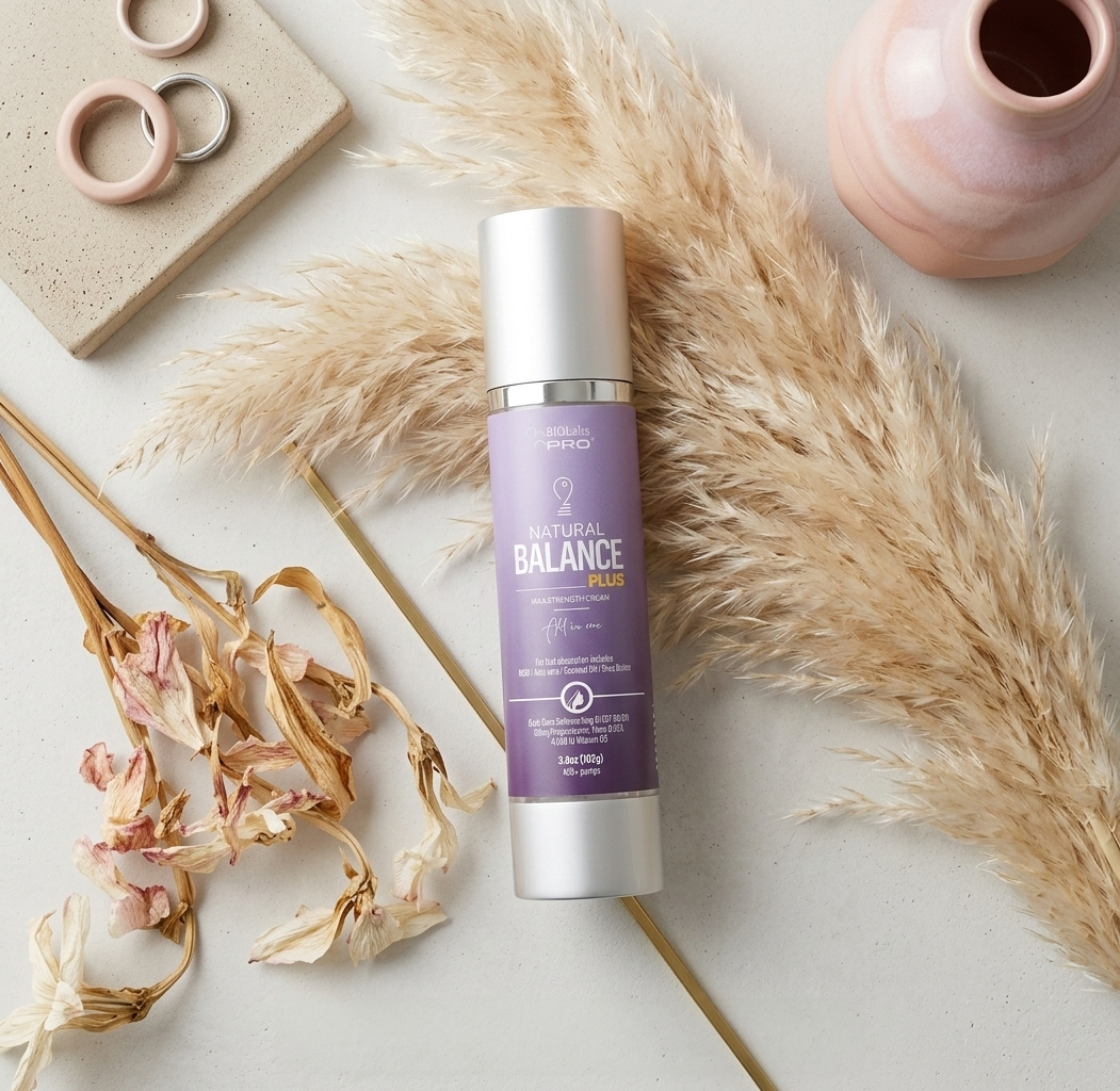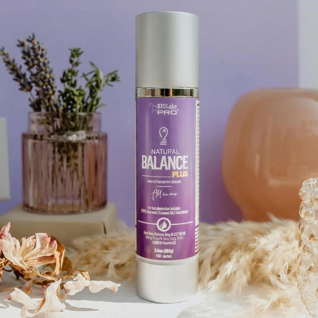 BIOLabs PRO Natural Balance PLUS Cream is a topical cosmetic bioidentical hormone formulated to support hormonal balance, particularly during menopause. It combines estriol (~1%), estradiol (~0.24%), progesterone (~6%), DHEA (~0.06%), vitamin D3, and other supportive ingredients to help alleviate symptoms associated with hormonal fluctuations